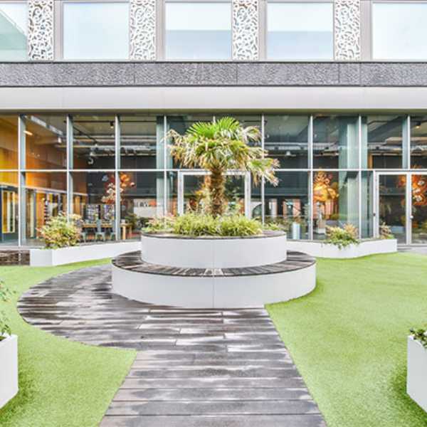 Increased Safety & Durability: Modern commercial turf systems include shock-absorbing padding and non-abrasive fibers, reducing injury risk in playgrounds, rooftop decks, and sports areas. It withstands intense daily use from employees, customers, or events without wearing out for 15-20 years.